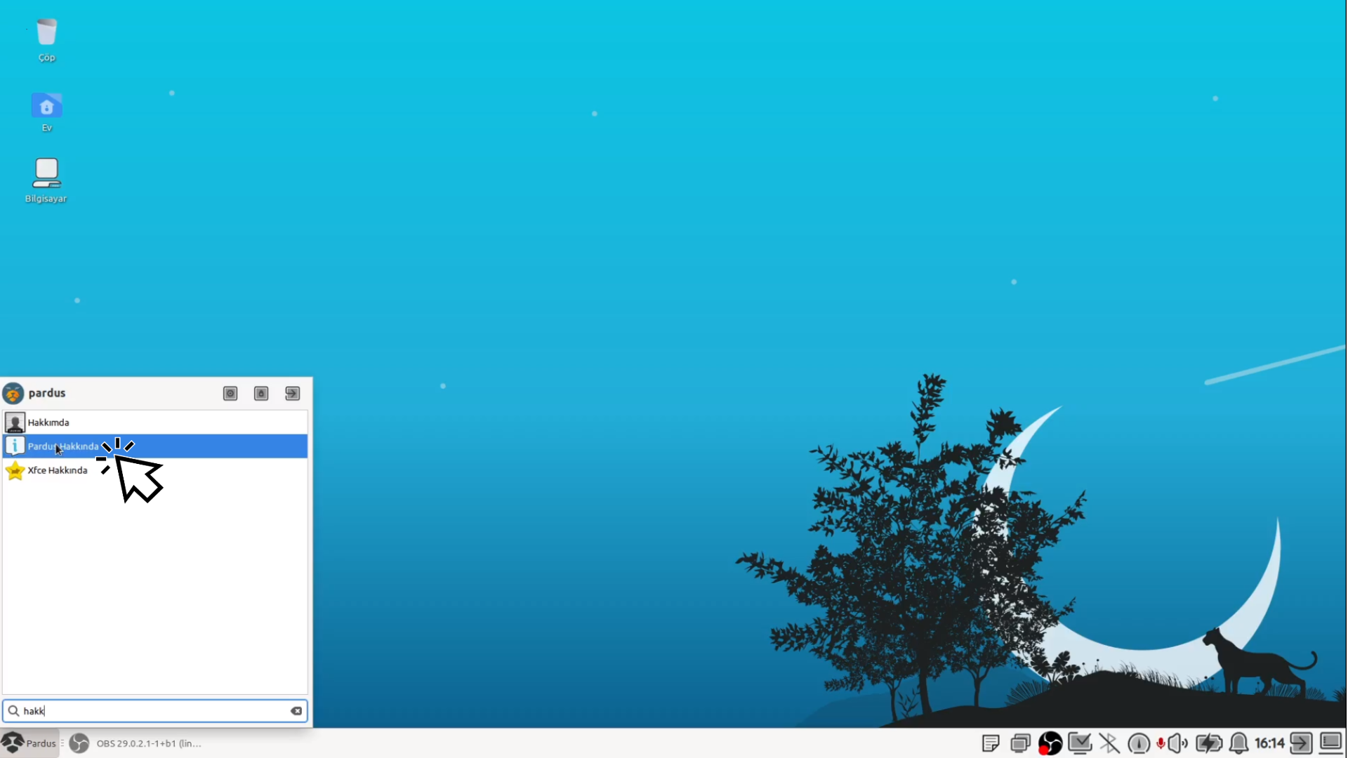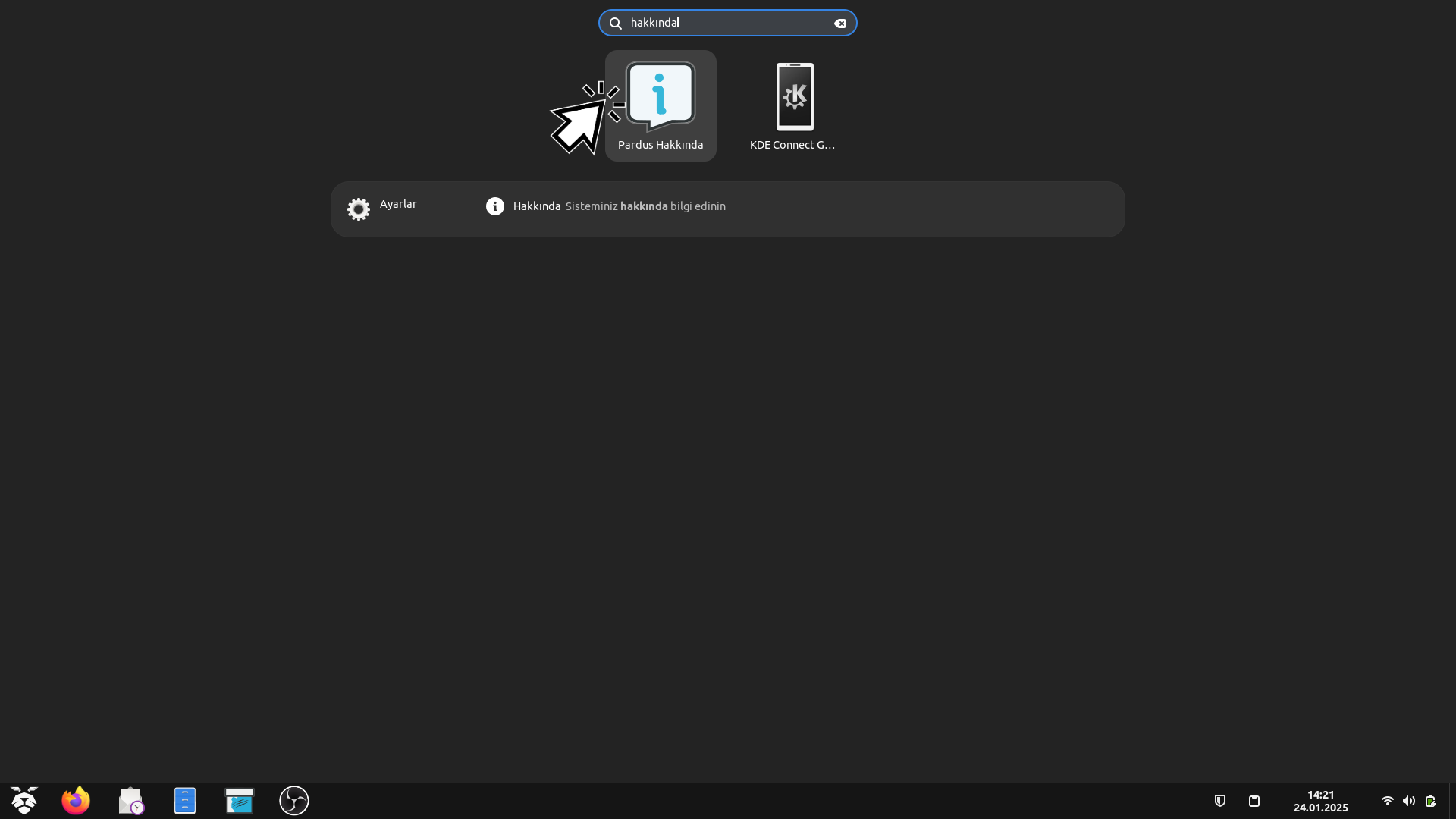 Arama kutusuna Hakkında yazın ve uygulama ikonuna tıklayın. | Arama kutusuna hakkında yazdığınızda 3 farklı uygulama göreceksiniz. "Pardus Hakkında" uygulamasını açın. |